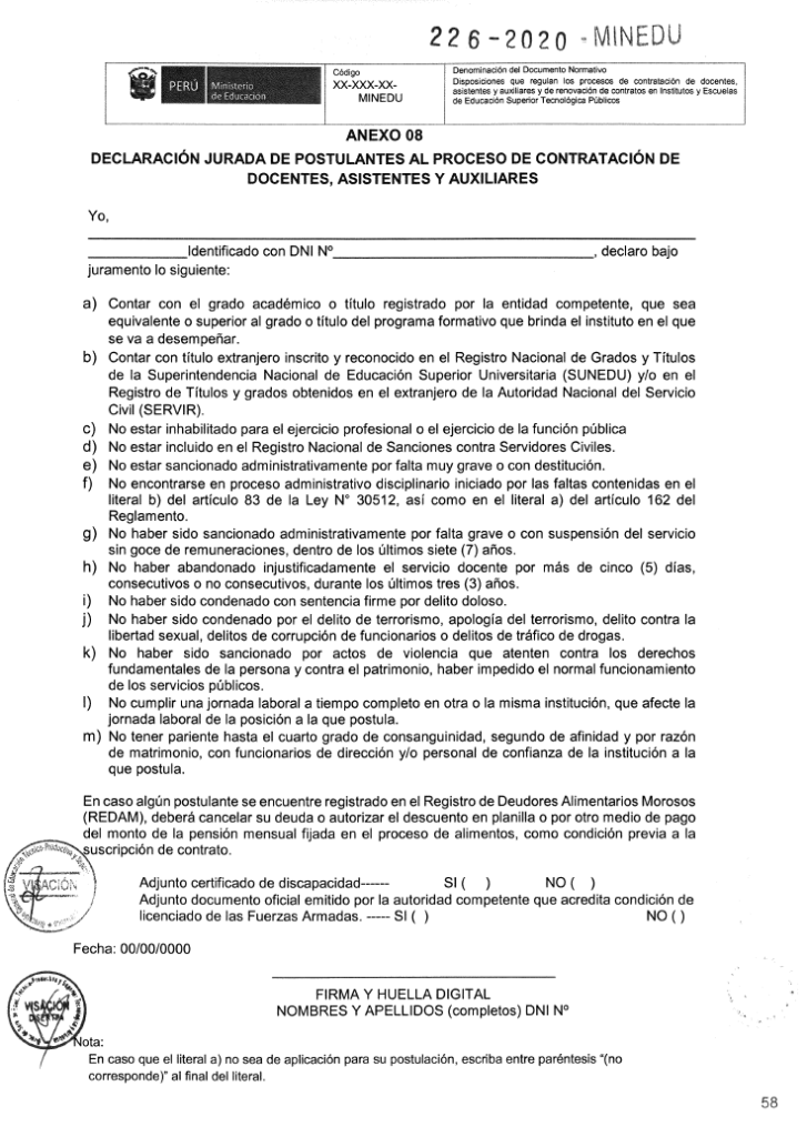 REQUISITOS MÍNIMOS: DECLARACION JURADA PARA ADJUNTAR: FICHA DE REGISTRO: ficha-del-postulante-docente-regular-2Descarga NORMA QUE REGULA: RVM-N°-226-2020-MINEDU.pdfDescarga
